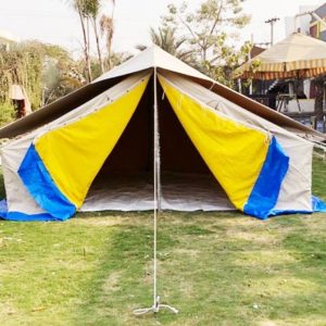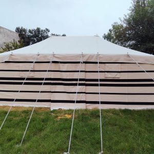 This is famous Deluxe Tent, usually made in Cotton canvas in 2 layers, 3 layers or single fabric. Tent is commonly used in hot climates in Gulf & deserts areas. It supported by iron poles and ropes suspension system which helps facing strong winds and economical costs than frame tents.
